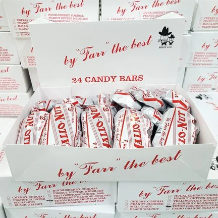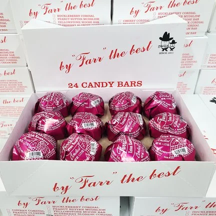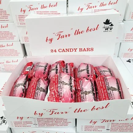 Delicious hand-dipped candy made in Idaho! Click on any image for more photos, product description and/or to add to your shopping cart. Idaho Huckleberry Cordial $34.00 Teton Raspberry Cordial $34.00 Strawberry & Cream Cordial $34.00 Idaho Orange & Cream $34.00 Yellowstone Moose Bar $34.00 Peanut Butter Mudslide $34.00 Blueberry Blondie Cordial $34.00 Cherry Cordial $34.00 Mallo-Nut Bar $34.00 S'mores Bar $34.00 Grizzly Tracks Bar $34.00 Peanut Cluster $34.00 Idaho Spud Bar $34.00 Assorted Cordials $50.40 Assorted Farr Bars $34.00